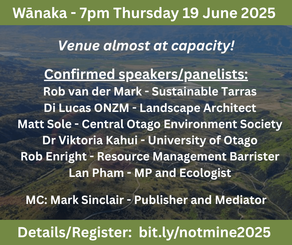 We are holding urgent public meetings in Dunedin on the evening of Tuesday 17 June, and in Wānaka two days later on Thursday 19 June. Further details about the meeting, and the mine, are below on this page, but here’s the sign-up form to attend either of the meetings.