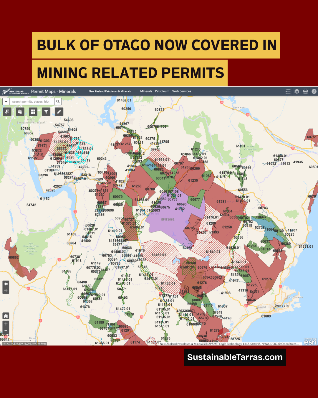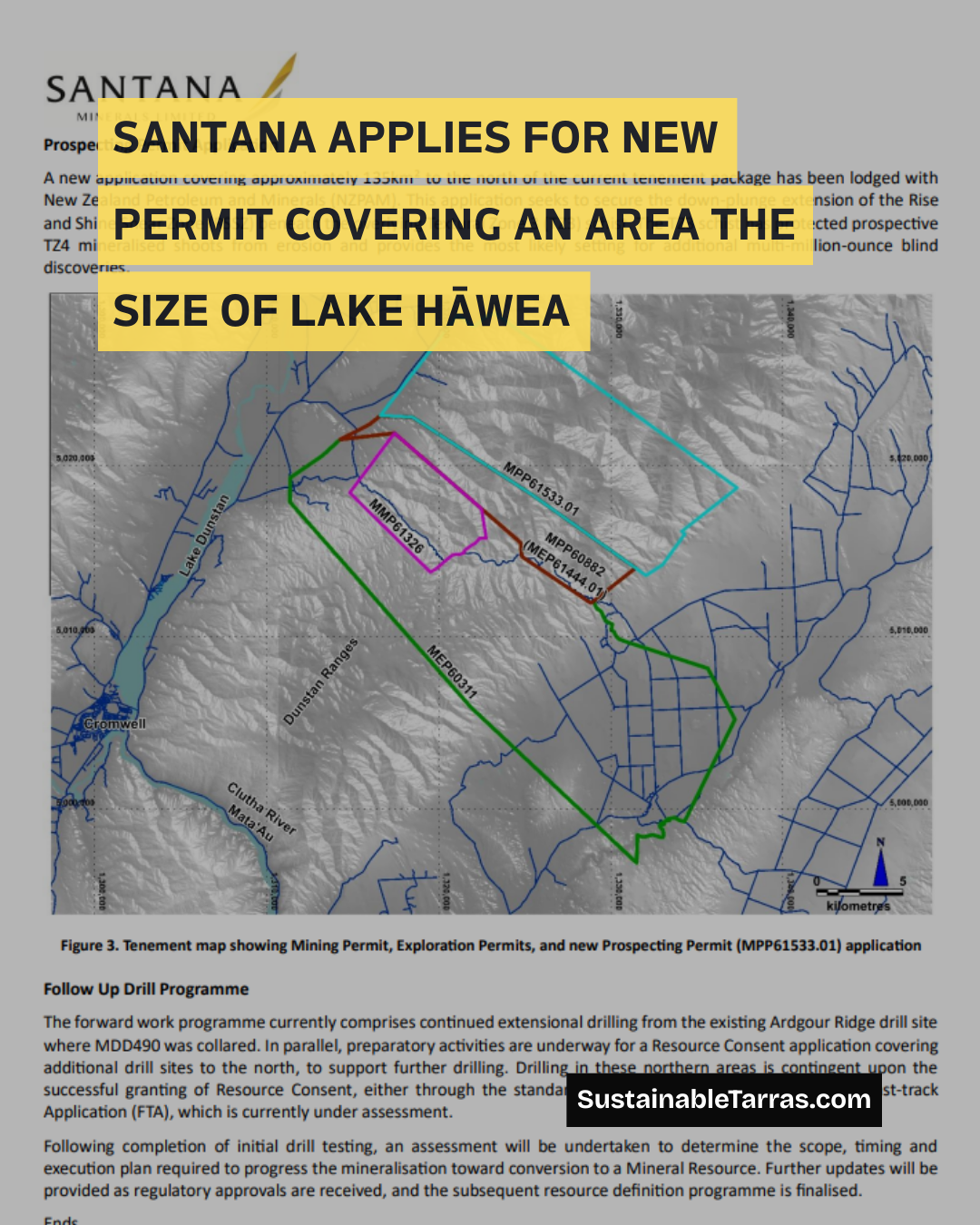 Santana Minerals is applying for the right to mine a large area of the Dunstan Mountain Range, seen in purple above, meaning the initial mining site could be the beginning of a series which reaches over the range towards the Maniototo. Other mining companies with exploration permits throughout Central Otago will be watching this development with interest.